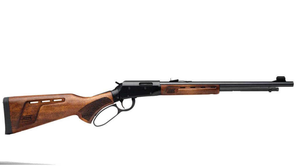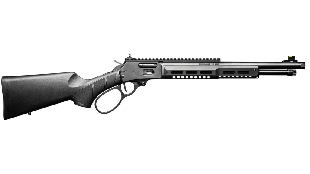 The 16.3-inch 410 stainless-steel aluminum barrel (with a threaded muzzle) has a twist rate of 1:16, the receiver is forged 416 stainless steel, and the forend, which has 15 M-LOK slots, is aluminum with a hard-coat anodized finish. The black synthetic stock has textured grip panels. The rifle also has a large loop operating lever and a manual cross-bolt safety.