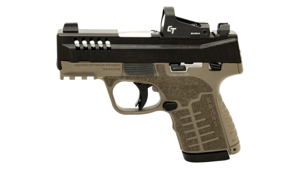 The new Savage Stance XR has an expanded capacity of 13+1 and a quick-release optics mount that allows the user to easily switch optics. Internals remain the same as on the original Stance. Consumer-selected options still include three colors, manual safety or none, and standard or tritium sights. An already-mounted optic is also an option. SRP: $469-$659.